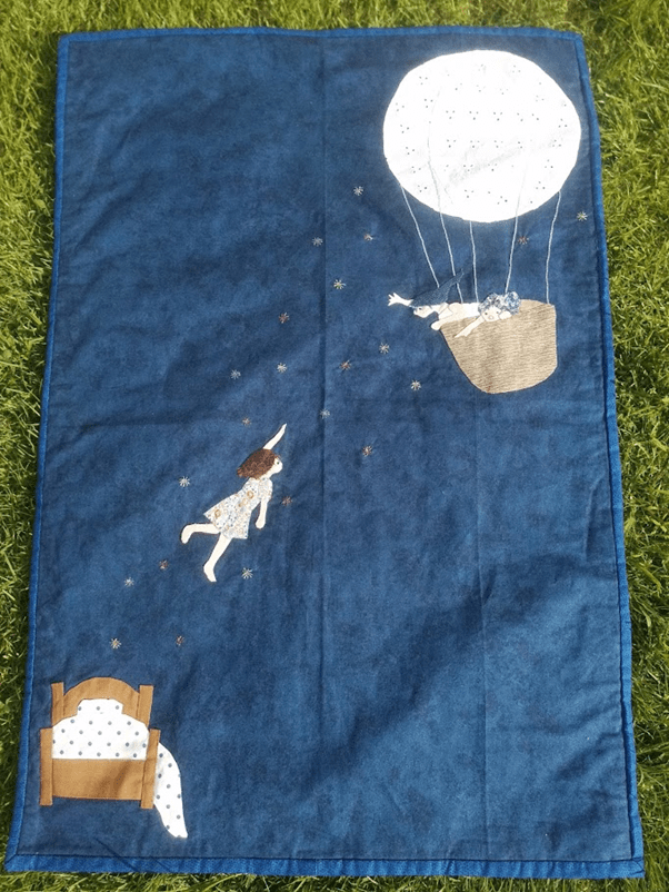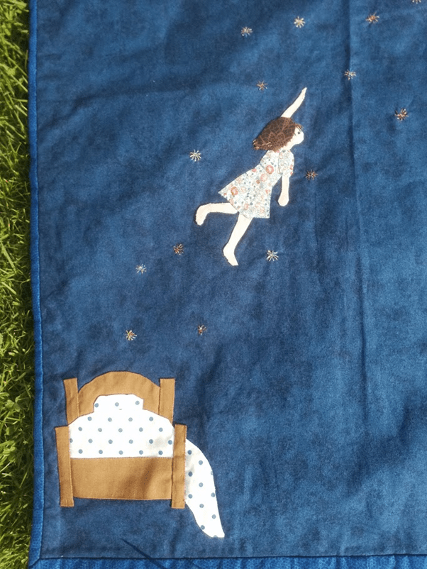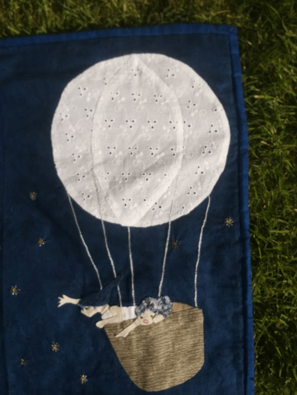 In it, you can see a little girl swimming in a starry night towards a hot air balloon. Two little children with blue hair are welcoming her. It’s the stuff that dreams are made off. I am not a religious person, but in my mind these little blue -hair people can be angels or from the afterlife. It’s intolerable to imagine the small coffin of a baby put into the ground, let alone watch it. There is, I have no doubt, no greater loss than the loss a child. I couldn’t, in my mind, leave Matilda behind. I needed to know that somewhere, even fleetingly, she wouldn’t be alone. The only place I could do that was in my imagination, because reality was too absurd, too cruel, to bluntly accept it. This quilt was the only way I found to express my feelings at the time. It wasn’t cathartic, it was therapeutic, but it was necessary. A lot of love, sorrow and broken dreams went into this clumsy piece of work.