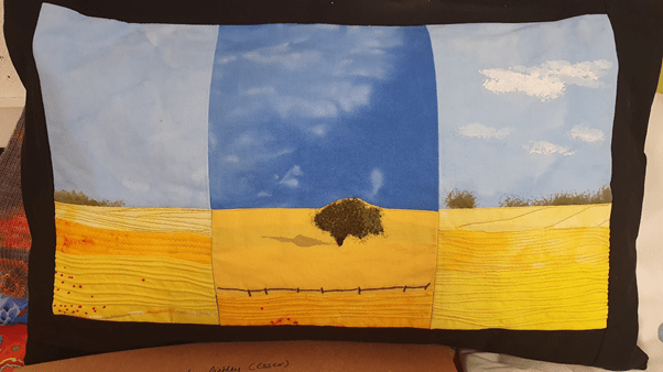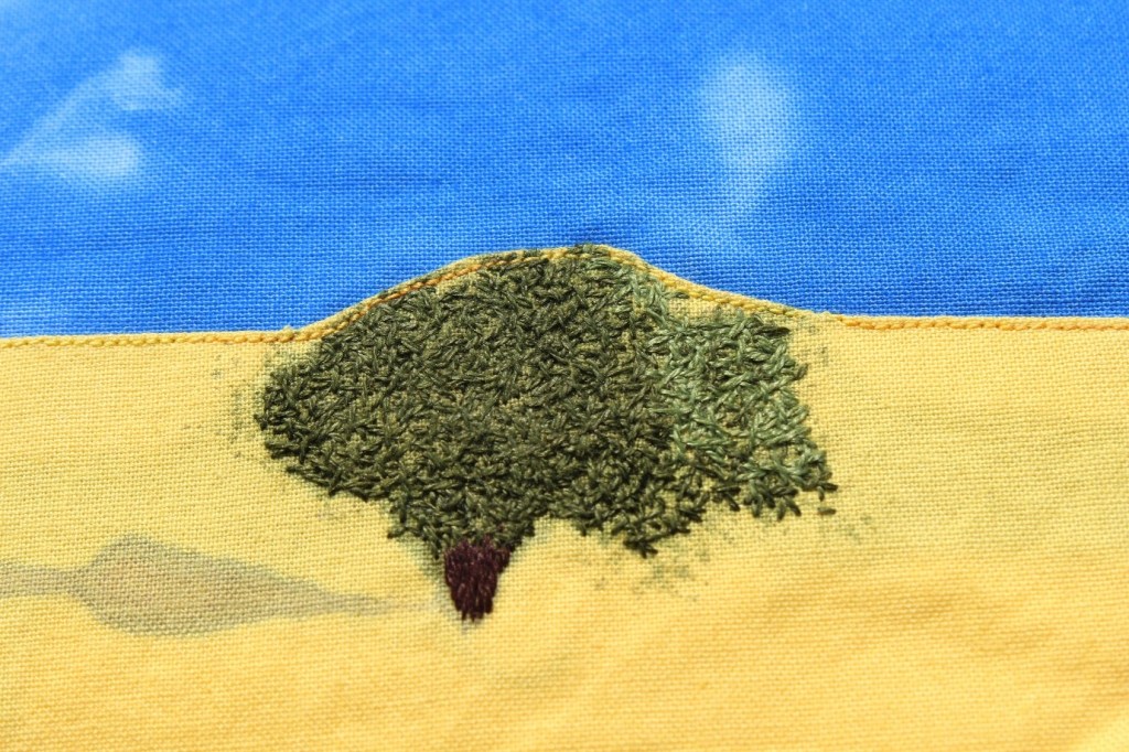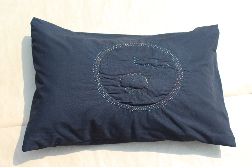 The trapunto technique has been used for the back of the cushion, with a repetition of the tree and cloud. The thread used for the stitching is a variegated thread from King Tut.
