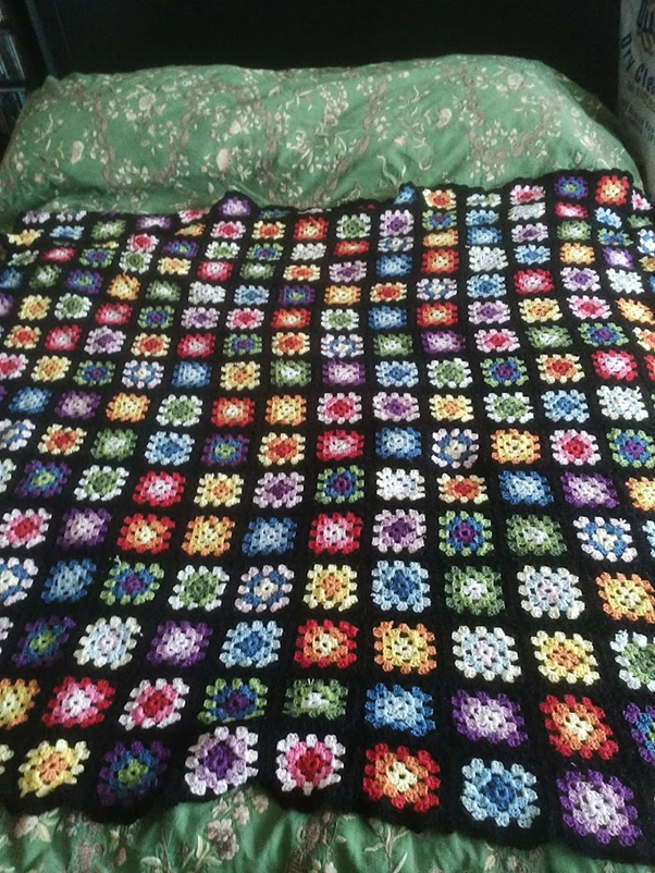 Not everything is about quilting and patchwork. In the evenings and during the winter, when there is less natural light, I turn to other forms of textiles and crafts. Knitting is my predilection but I occasionally do crochet. One of my daughters has a taste for the 70s fashion and decoration so I made this blanket for her