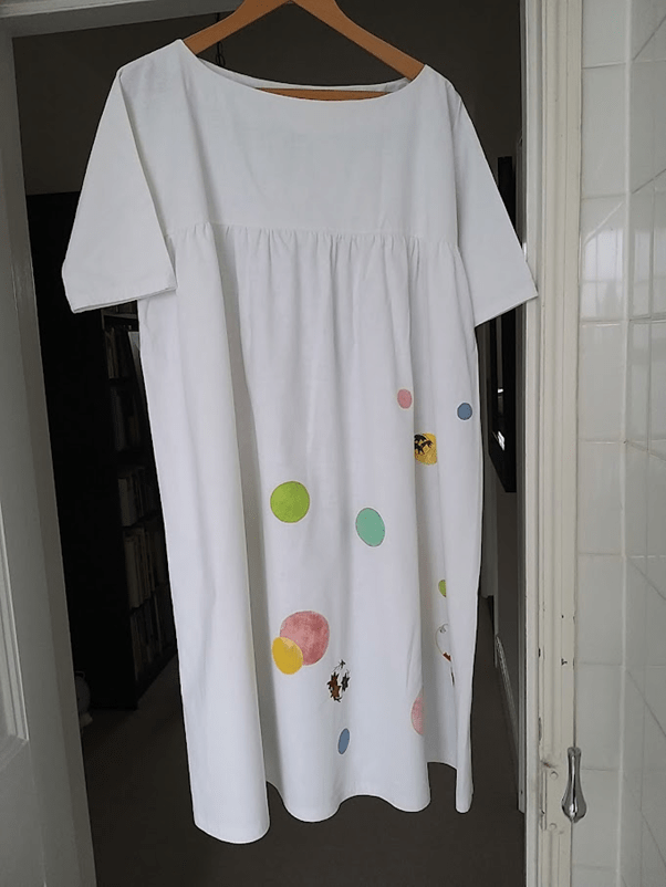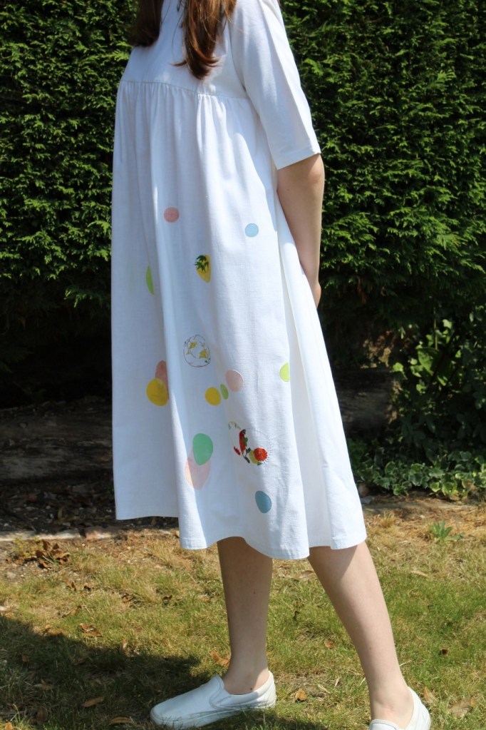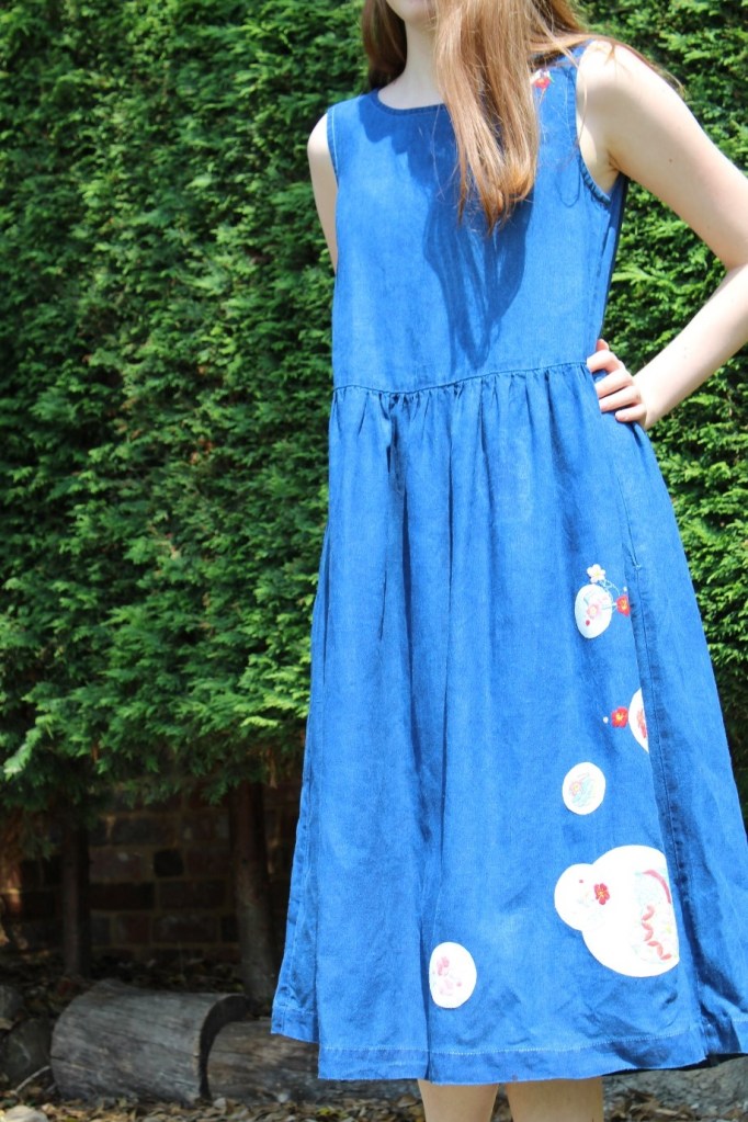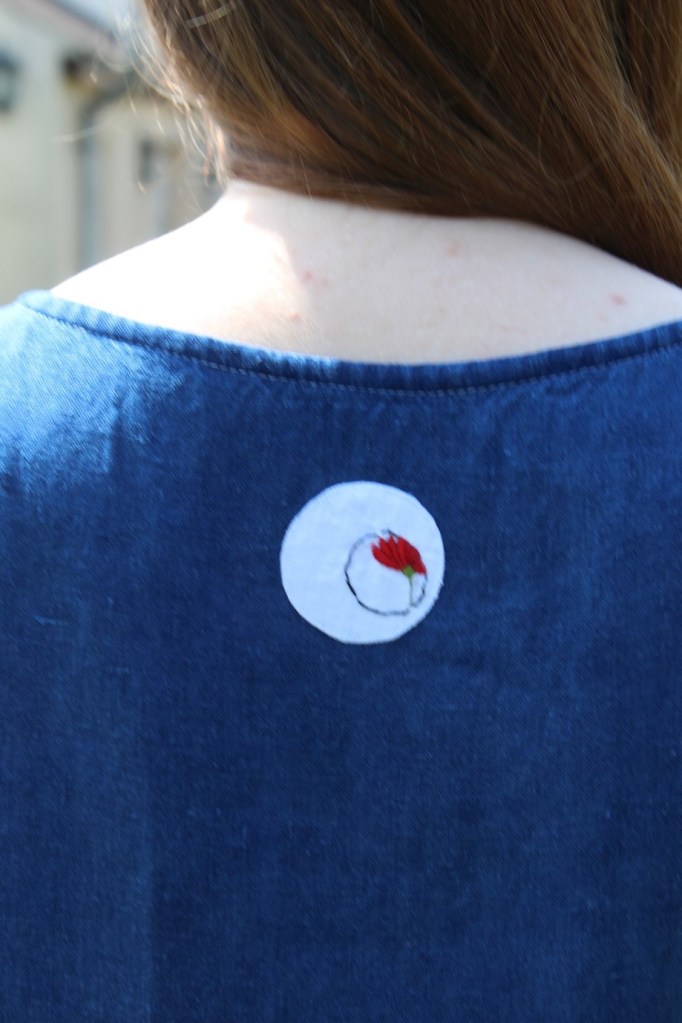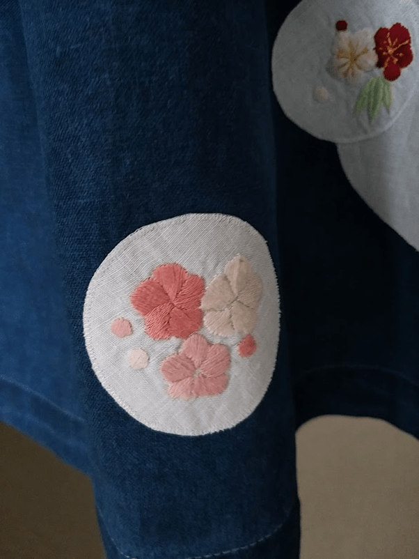 The beauty of applique is that it can be used on many textiles. In summer 2019, I cut and saw two dresses using Japanese patterns. I dyed one with indigo. Then I added traditional Japanese Kamon ( traditional Japanese crests) that I re-designed and reformatted. Studying Japanese colour arrangements, I came to notice that they often use pastel colours with a touch of brightness that seems to disturb the harmony of the design. I made sure to include this quirkiness in my designs. The dresses were then hand embroidered with the patterns directly or I appliqued the patterns after having embroidered them.