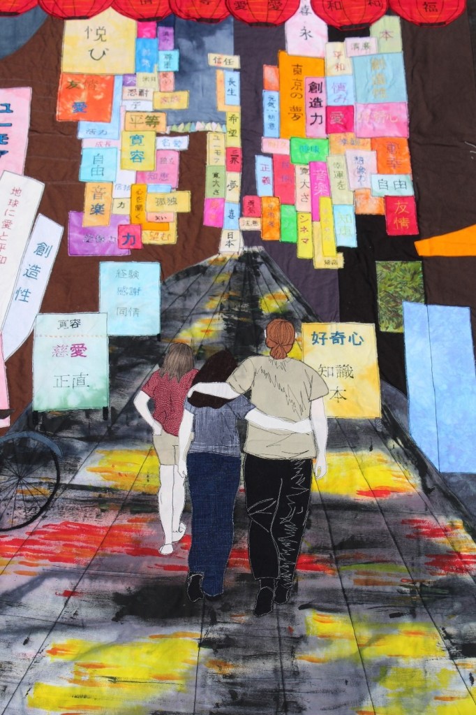 Because of the period, and my shattered dreams, I decided to include some of my values and hopes in the quilt. So instead of writing signs saying things like restaurant or cinema, my signs all have hidden messages. They say (the list is not exhaustive) things such as “experience”, “hope”, “enthusiasm”, “gratitude”, “growth”, “happiness”, “vitality”, “trust”, “wisdom”, “justice”, “peace”, “generosity”, “kindness”, “tolerance”. “courage”…The lanterns compose a sentence: “Love and peace on earth for all”. Now I must sadly admit that, although a friend’s Japanese teacher double-checked my vocabulary and spelling, once I used Google and Word to reproduce them on paper, it seems that different types of writing were used. So I apologise to any Japanese speakers if I made mistakes. They are entirely due to my ignorance