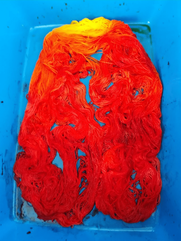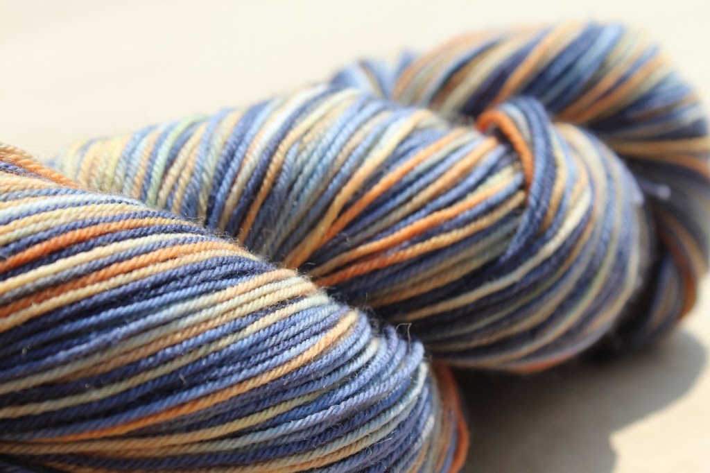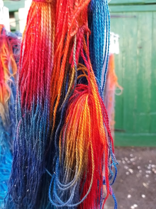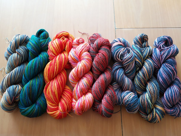 Getting ready for the winter months, I undertook some wool dyeing exercise. Spread on several days. The control of the colours is much harder than fabric paints, but much easier than procion dyes (and less damaging to my lungs, which is very surprising.) I have been exploring different harmonies of colours, starting with the use of the basic red-yellow-and-blue, and little by little expanding my palette of nuances. It’s a work in progress, and so far I used mainly Superwash Merino wool for socks, with either 25% of nylon or silk (for a more luxurious feel).