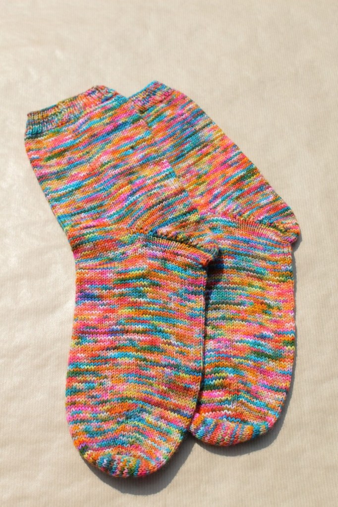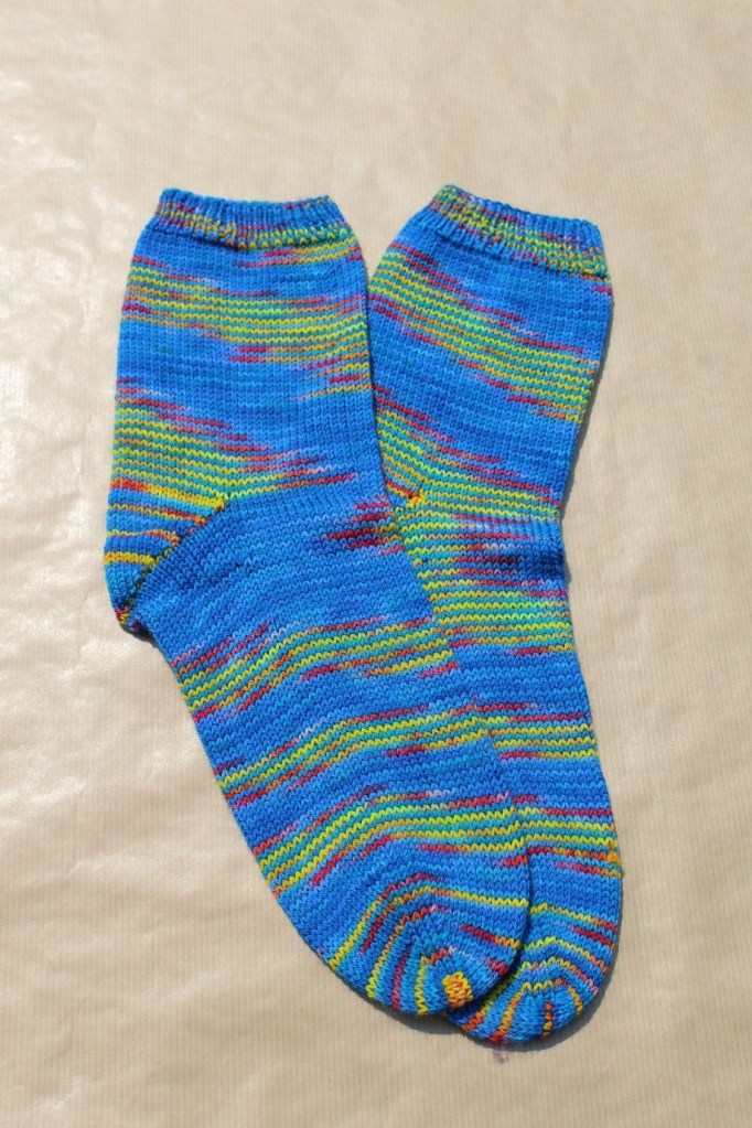 Example of the finished products – hand-dyed and hand-knitted. A pair of socks take on average 12 to 14 hours to make, including the dyeing process. Knitting alone takes 10 to 12 hours.