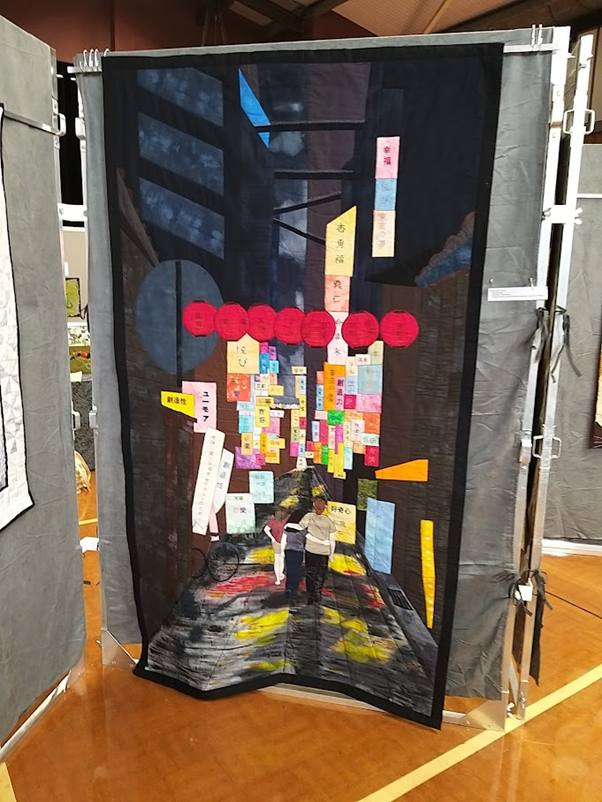 The three people in the centre are my husband, my eldest daughter and me. In 2020, after having gone through throat cancer harsh treatment, my husband had decided we should accomplish one of our dreams and go back to Japan with our daughters. The covid pandemic’s lockdown put an end to that dream – hence my quilt. If we couldn’t go in person we could at least be there in spirit! The people are machine embroidered and appliqued. The bicycle and the writing on the neon signs are hand embroidered, with a few of them hand-painted, like the lanterns. I used very little red in my quilt in order to have the lanterns really popping out.