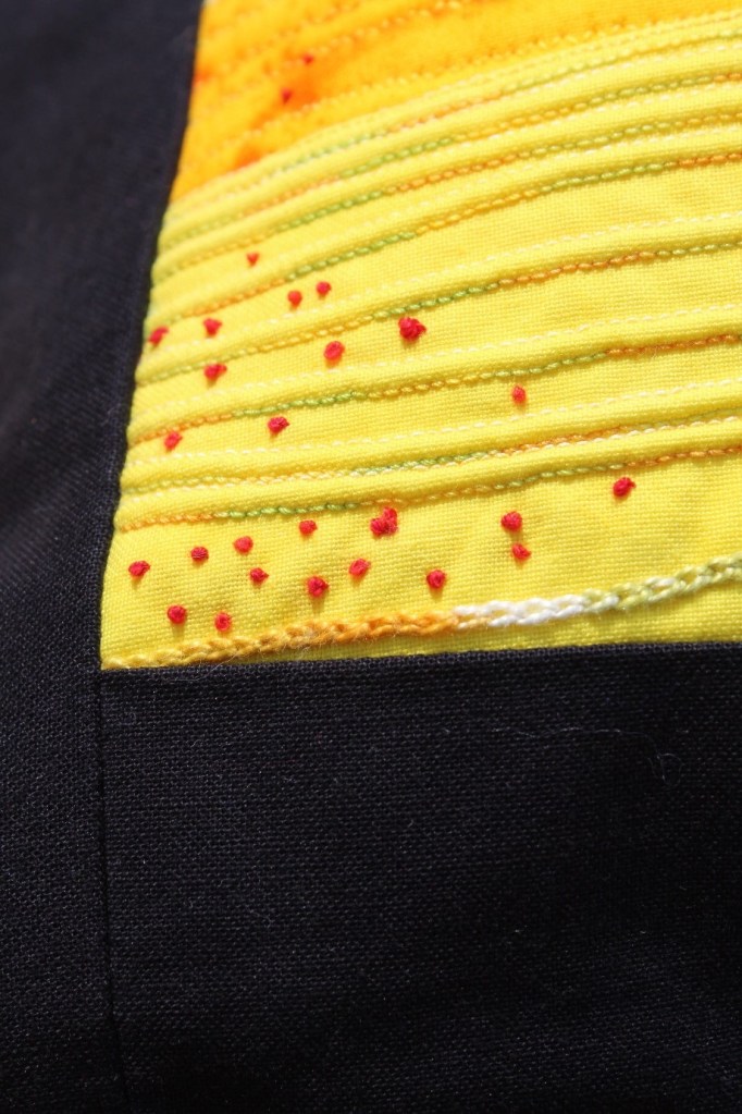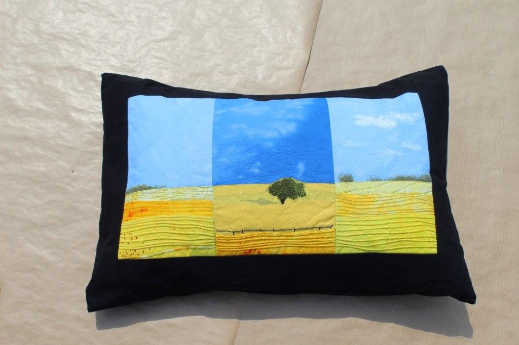 Cushion triptych composed of two different images of a wheat field in different light and weather. I dyed all the fabrics, except the black one, by hand, using Procion dyes. The lines are sewn by machine with single and double needles, the poppies and tree are embroidered by hand. The tree was first painted with Jacquard fabric paints, as well as the hedges on both sides.
